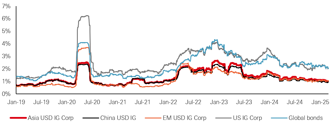 Meanwhile, high-yield spreads remain wide, presenting a strong carry opportunity, especially as the asset class continues to evolve structurally following extensive deleveraging in China’s property sector. Notably, this segment now accounts for only 7 per cent of the universe, allowing for greater diversification across high-growth markets.
