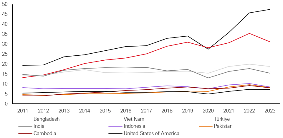 Source: WTO, data as of February 2025. Note: China is excluded which is the largest apparel exporter.