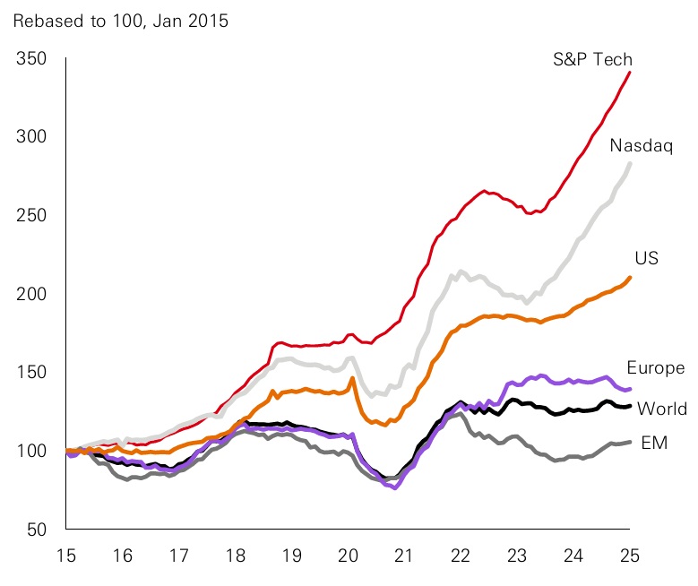 Regionally, we anticipate that emerging Asia will gain greater investor attention. With the launch of the DeepSeek models broadening and accelerating access to leading AI capabilities, adoption in these markets is supported by inherent advantages in monetising the technology. And as the cost of compute declines, operational gains and enhanced product and service offerings should feed through to earnings growth in these markets. Accordingly, we could see the significant edge in profitability that fuelled historic outperformance by US tech firms over the last decade begin to erode.
