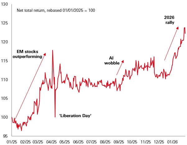 Emerging market stocks have got off to an exceptionally strong start in 2026. In some ways, it’s a case of history repeating. This time last year, a sharp decline in the US dollar was under way, and EM stocks were strengthening just as US stocks were fading. After the volatility around April’s ‘Liberation Day’ tariff surprise, EM markets went on to outperform the US for the full year.