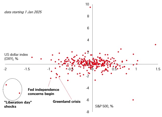 Amid January's geopolitical turmoil, we saw echoes of last April’s “Liberation Day” market action: US stocks declining in lockstep with US Treasuries and the US dollar. This is important. It provides further evidence that traditional portfolio diversifiers may struggle to perform as expected, particularly when US policy decisions – whether it be around trade, the Fed, and foreign relations – are driving investor caution.