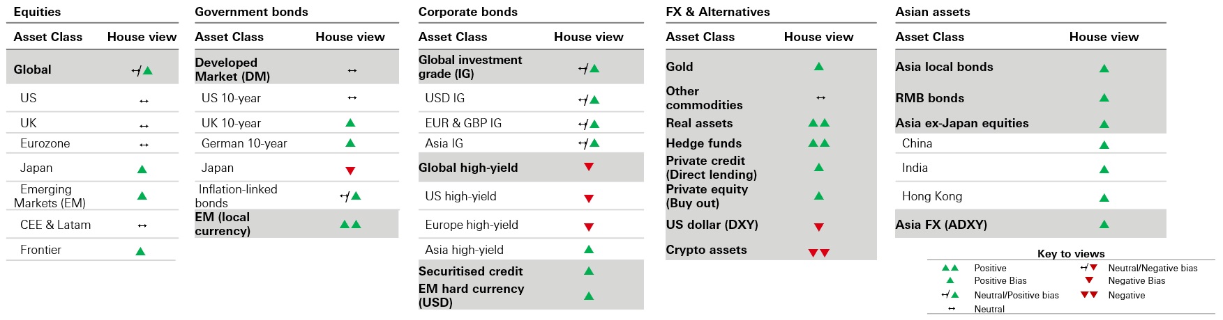 - Icons: ↑ View on this asset class has been upgraded – No change ↓ View on this asset class has been downgraded