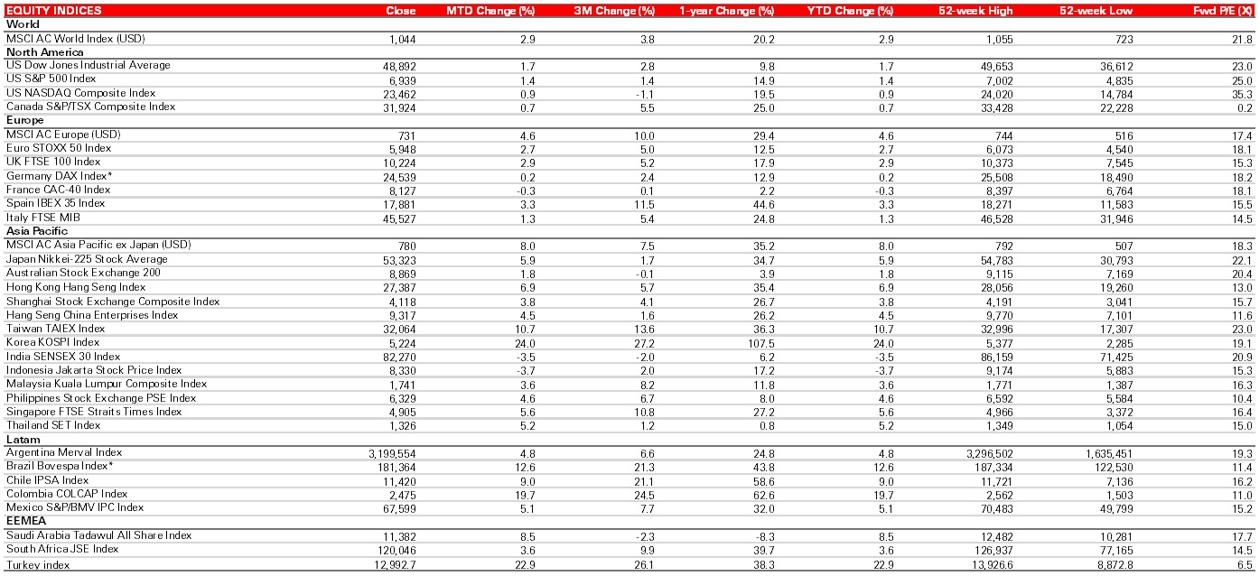 Sources: Bloomberg, HSBC Asset Management. Data as at close of business 31 January 2026. (*) Indices expressed as total returns. All others are price returns.