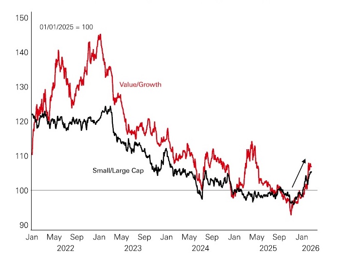 For the rest of 2026, there is a good chance this dynamic continues. The current macro backdrop of sticky inflation and interest rates is traditionally a positive one for value names, as we saw in 2022. Sector broadening is also helped by spillover effects of the AI capex boom and surge in metals prices.