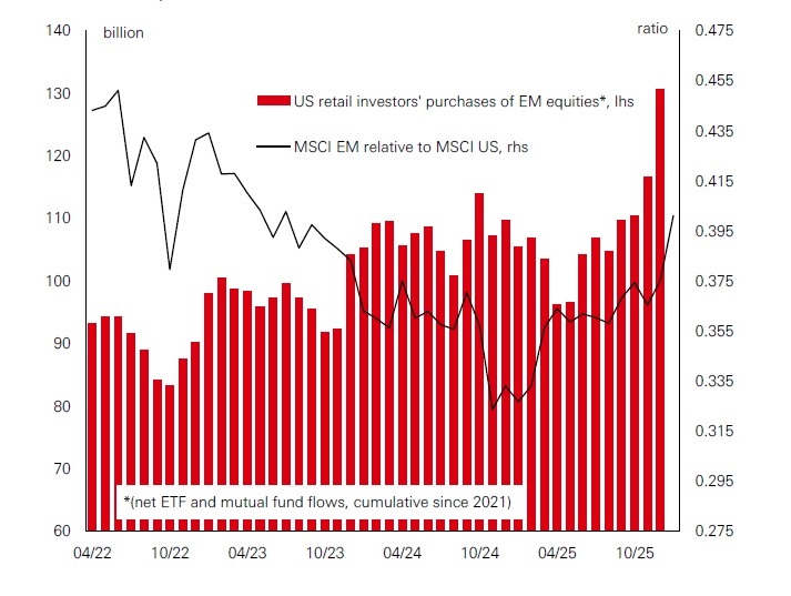 It has been hard to miss the outperformance of emerging market stocks versus the US recently. And when you look under the bonnet, there are signs that investors are reallocating away from concentrated US exposure to regions with potentially more balanced growth and better diversification. This is increasingly evident in portfolio flows. Indeed, US retail investors’ purchases of EM stocks have been rising since the middle of last year. Given that EM is coming from a lower base, even a modest reallocation from the US to EM can potentially drive outsized performance.