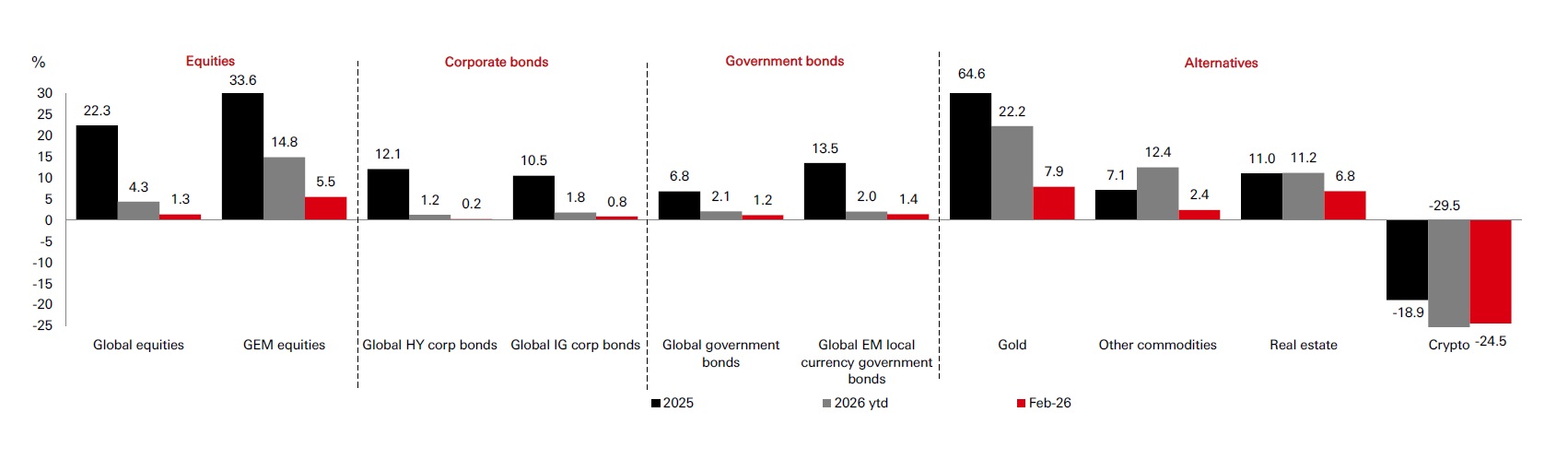 Source: Bloomberg, all data above as at close of business 28 February 2026 in USD, total return, month-to-date terms. Note: Asset class performance is represented by different indices. Global Equities: MSCI ACWI Net Total Return USD Index. Global Emerging Market Equities: MSCI Emerging Market Net Total Return USD Index. Corporate Bonds: Bloomberg Barclays Global HY Total Return Index value unhedged. Bloomberg Barclays Global IG Total Return Index unhedged. Government bonds: Bloomberg Barclays Global Aggregate Treasuries Total Return Index. JP Morgan EMBI Global Total Return local currency. Commodities and real estate: Gold Spot $/OZ, Other commodities: S&P GSCI Total Return CME. Real Estate: FTSE EPRA/NAREIT Global Index TR USD. Crypto: Bloomberg Galaxy Crypto Index.