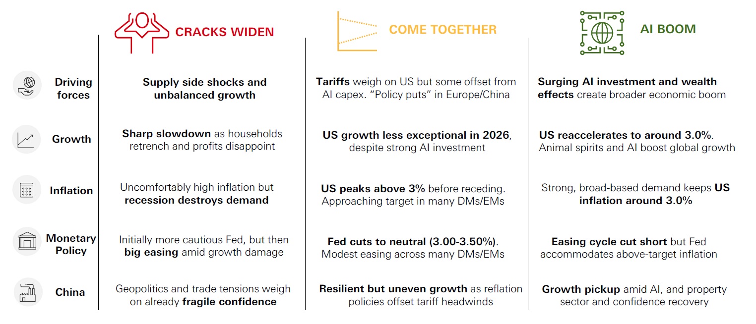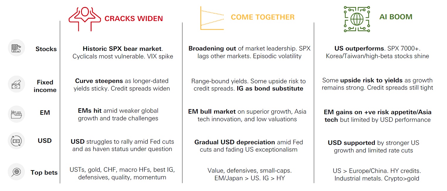 • Equities — While the AI megatrend still dominates, we expect to see a continuation of the recent “great rotation” from growth and momentum, into value, which has benefitted Europe, Asia, and emerging markets. Global market performance depends on the outlook for oil prices, as well as profits growth