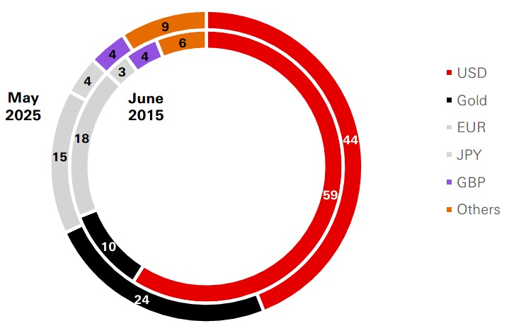 • The US dollar remains the dominant global reserve currency but is facing increasing scrutiny due to US fiscal deficits, geopolitical tensions, and shifts in reserve compositions