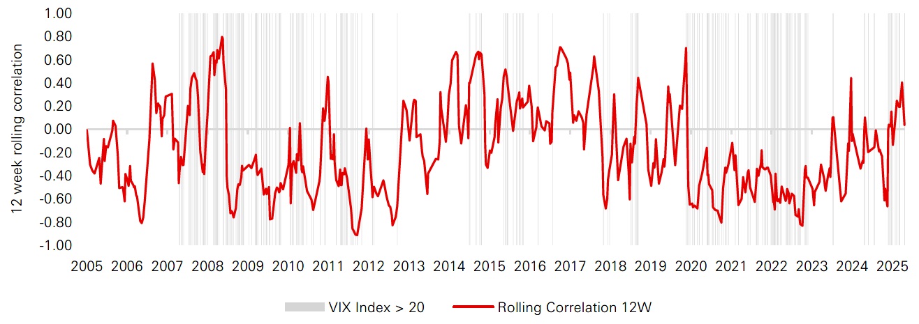 Traditionally, the dollar has strengthened in risk-off episodes, serving as the ultimate safe-haven. It is revealed by an analysis of the rolling correlation between the Dollar and the S&P 500 Index which is negative during periods of heightened market volatility, as indicated by spikes in the VIX index above 20. Yet in 2025, correlations shifted. For the first time in years, the dollar’s movements were positively correlated with equities rather than providing diversification. During key stress events, such as ‘Liberation Day’, the dollar failed to deliver its typical hedge function, raising doubts about whether it can still be relied upon as a portfolio diversifier.