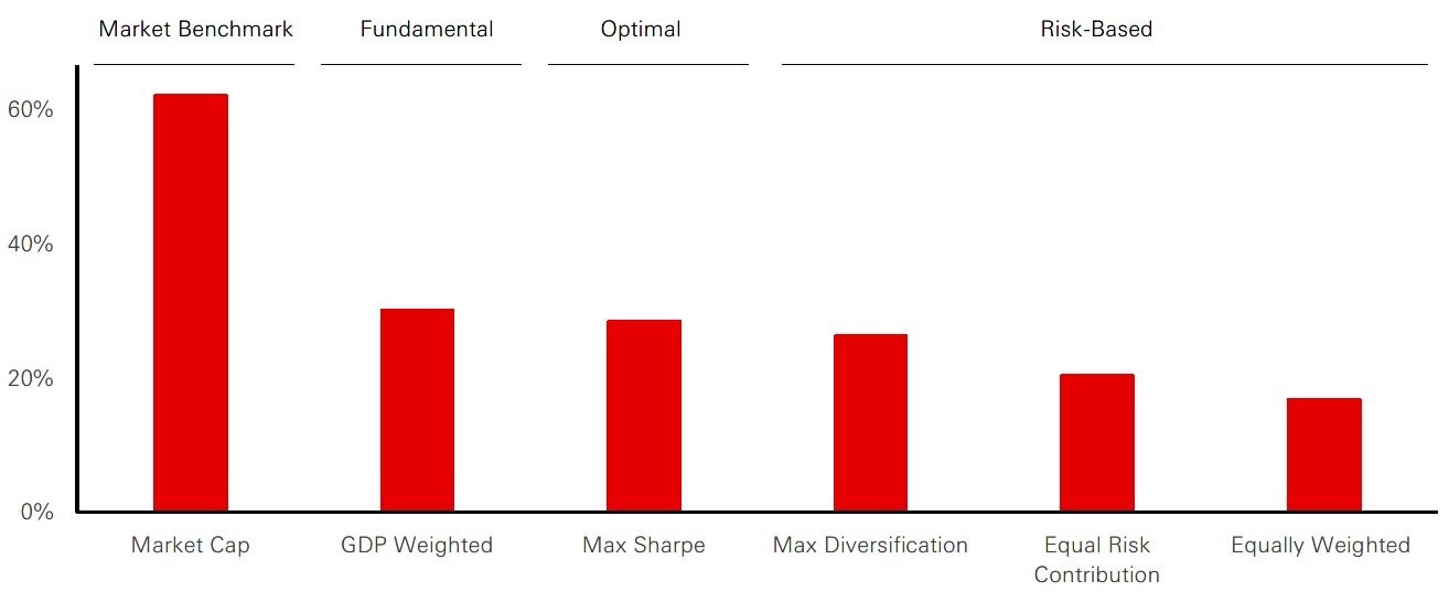 • For example, combining market-cap weighting with fundamental, optimal, or risk-based methodologies can help reduce US and technology concentration