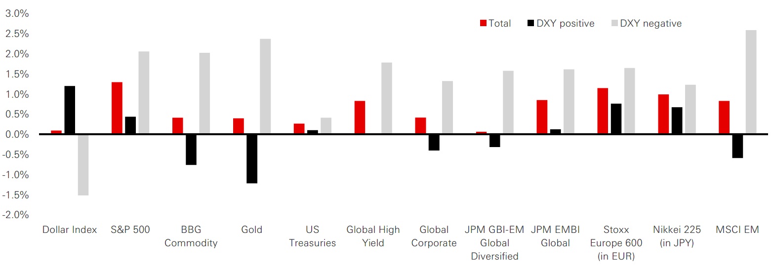 The dollar has been a powerful driver of asset performance since 1999. Dollar bull markets have typically weighed on commodities, gold, and emerging market assets, while developed market equities, particularly the S&P 500, have shown resilience. Conversely, dollar bear markets have consistently favoured commodities, gold, and emerging markets, with both equities and fixed income benefitting from weaker funding costs. This pattern of commodities and EM corporate bonds having strongest negative relationship with the dollar index is confirmed by their sensitivity to dollar swings. Today, this dynamic is especially relevant – any sustained dollar decline could provide a significant tailwind for emerging markets.