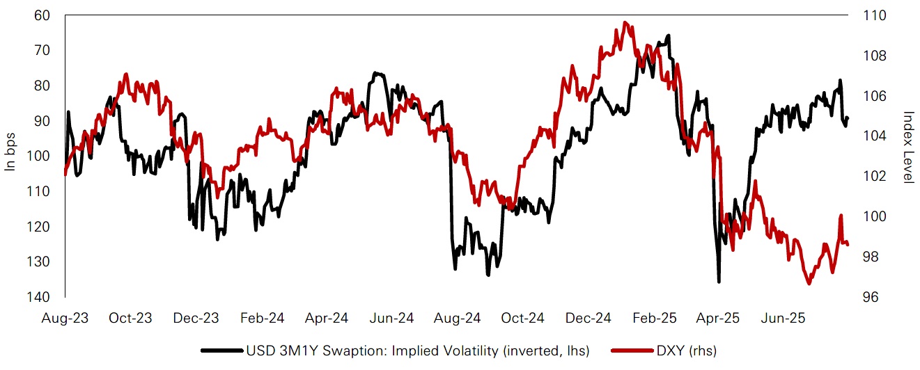 Options and derivatives markets provide another window into these shifting dynamics. For much of the past decade, hedging against dollar weakness was cheap; now, dollar puts trade at a premium to calls, signalling growing investor concern about depreciation. Moreover, declining interest rate volatility had historically supported the dollar, as policy clarity reduced uncertainty. Yet this relationship has broken down in recent months as reflected by the dollar failing to strengthen despite falling volatility.