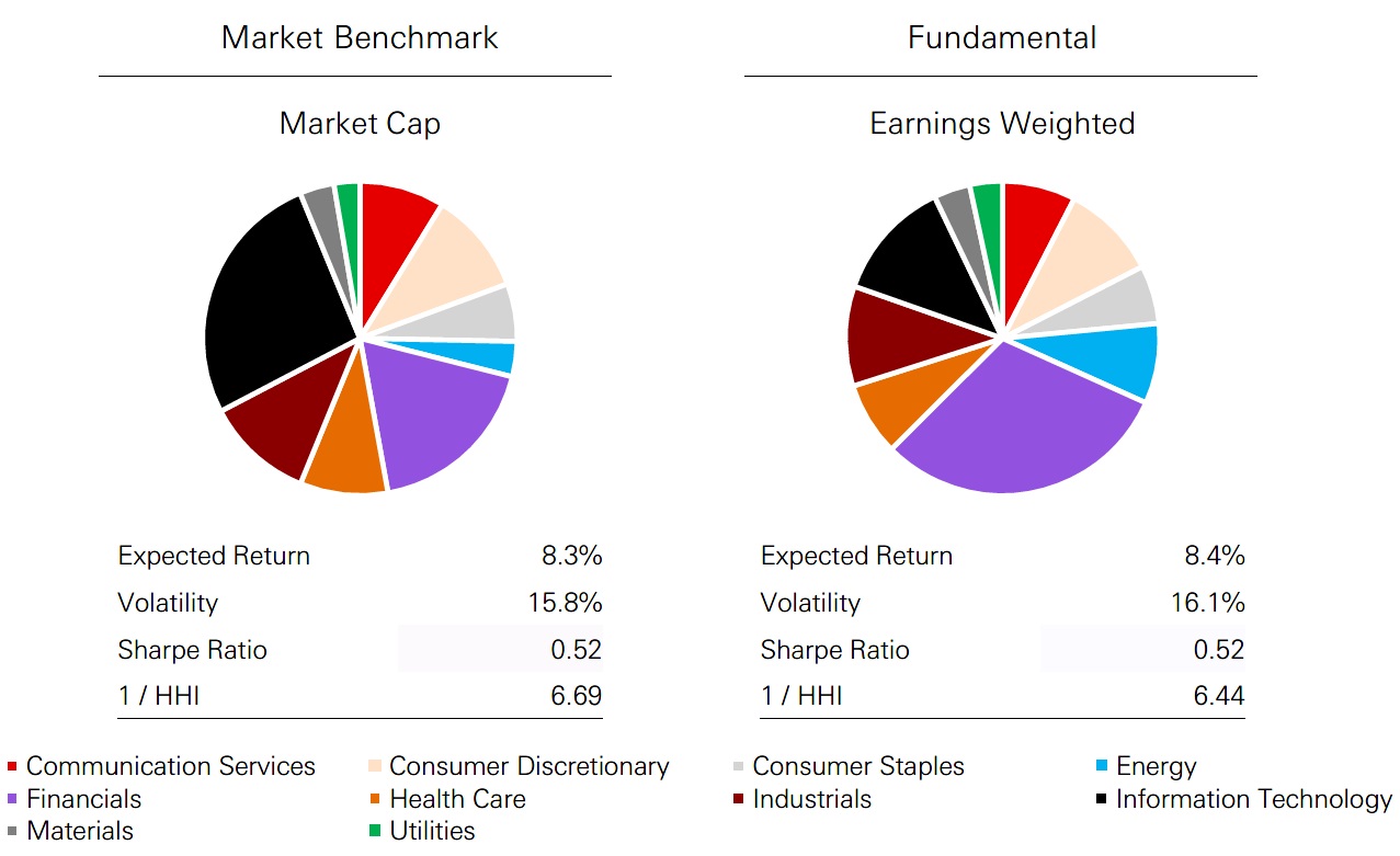 While sensible in theory, GDP weighting faces challenges such as data revisions, higher turnover, and historically weaker performance compared to market-cap indices. Similarly, earnings-weighted indices assign greater weight to companies that generate higher profits. This approach is intuitively appealing because it ties capital allocation directly to fundamental corporate performance. However, profits are cyclical and volatile, which means earnings-weighted indices can fluctuate sharply in response to economic cycles, reducing their overall stability.
