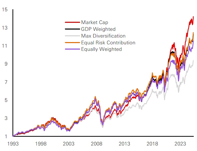 In today's environment, exploring options beyond pure market-cap weighting isn’t about abandoning traditional benchmarks but rather about acknowledging their limitations. It means recognising that alternative approaches – such as GDP weighting, earnings weighting, equal risk contribution, or mean-variance optimisation – offer different perspectives for addressing concentration risks. The key question, however, is whether investors are comfortable with the current level of concentration or if it’s time to consider these alternatives.