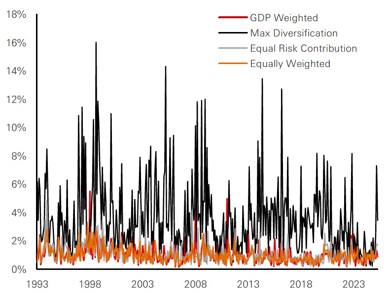 A 30-year backtest shows that market-cap weighting has indeed outperformed most alternatives— but crucially, this outperformance has been concentrated in recent years, driven by US mega-cap technology stocks. Historically, alternative weighting schemes such as ERC and equal weighting have delivered more consistent diversification and smoother drawdown profiles. Max diversification, while unstable, demonstrated resilience in certain downturns, though at the cost of high turnover.